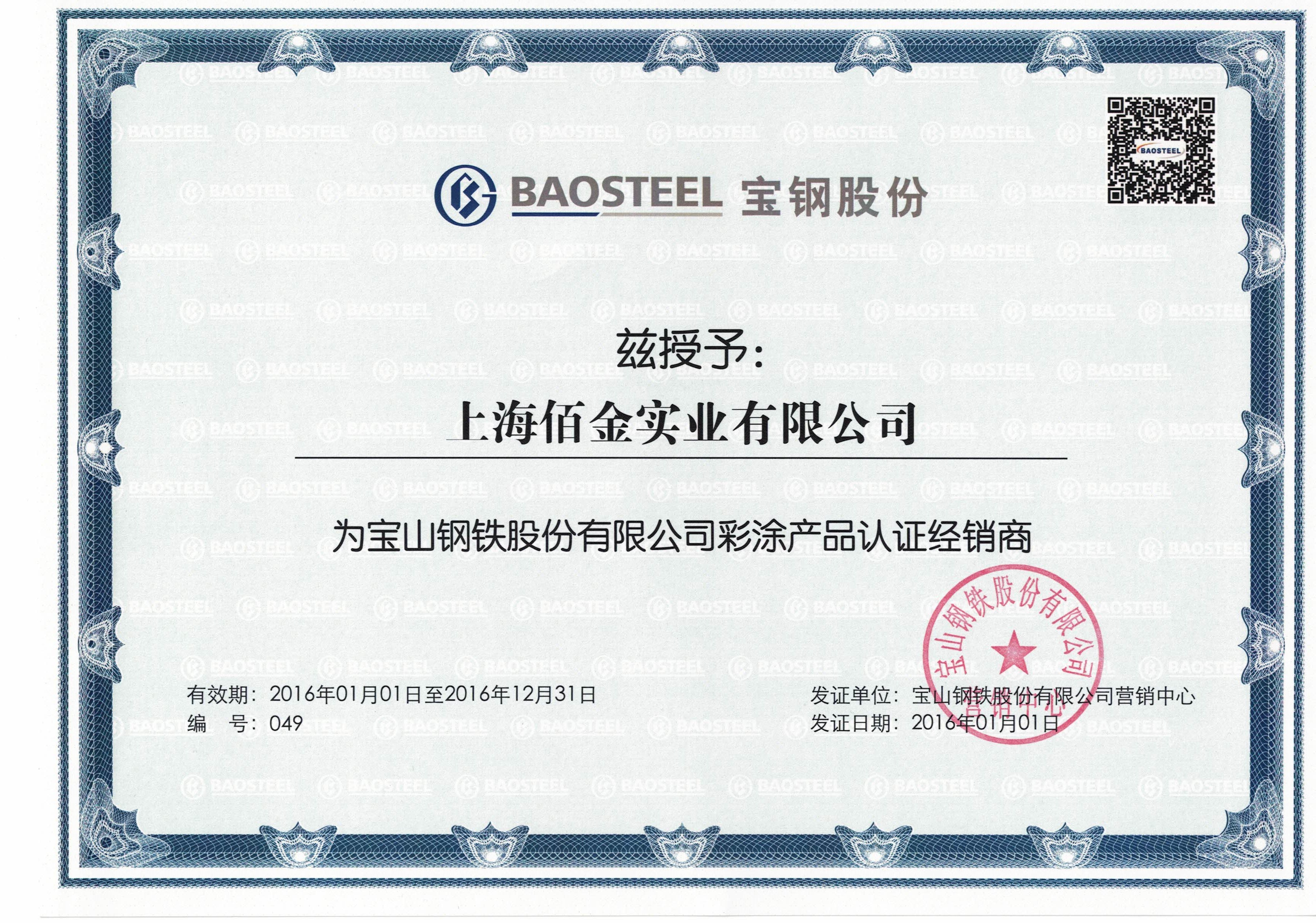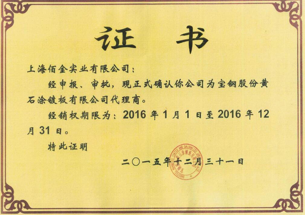 佰金華中銷(xiāo)售中心總公司上海佰金實(shí)業(yè)有限公司在幾年時(shí)間內(nèi),通過(guò)提供優(yōu)質(zhì)服務(wù),先后獲得了與寶鋼與寶鋼黃石等大品牌合作的機(jī)會(huì),獲取了他們的代理資格,代理證書(shū)如下: