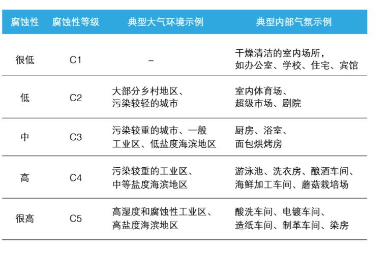 我國國家標(biāo)準(zhǔn)GB/T19292.1根據(jù)碳鋼、鋅、鋁等金屬第一年腐蝕速率測量值對大氣腐蝕性進(jìn)行了分類,但是彩涂板還缺乏使用環(huán)境(指大氣環(huán)境和內(nèi)部氣氛)腐蝕性分類的數(shù)據(jù),僅定性的將大氣環(huán)境和內(nèi)部氣氛腐蝕性分為5個等級即C1、C2、C3、C4、C5,其腐蝕性依次增強(qiáng),表示給出了不同腐蝕性等級對應(yīng)的典型大氣環(huán)境和內(nèi)部氣氛。