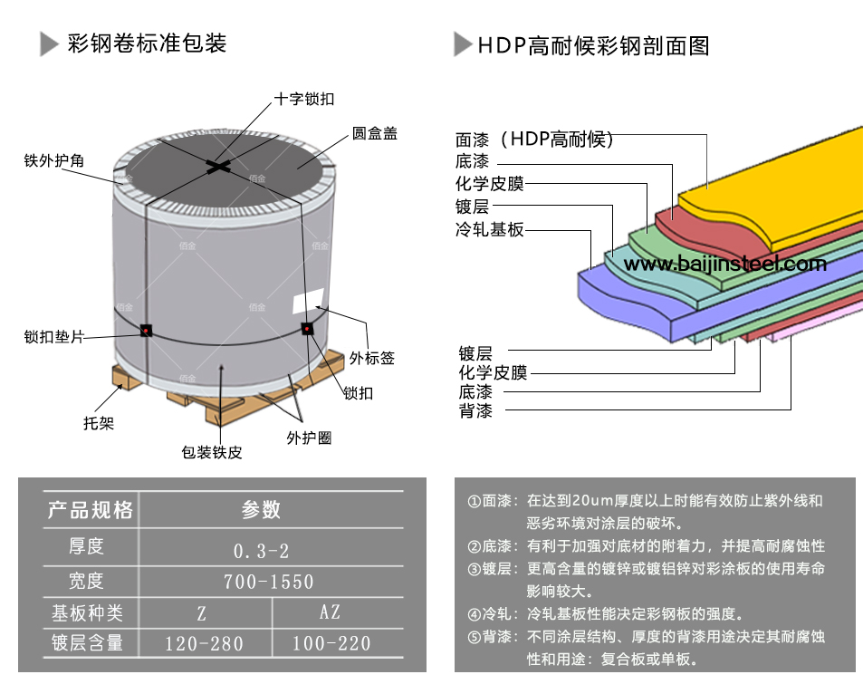HDP高耐候彩涂板采用HDP聚脂涂料,耐久性好,采用高分子量的樹脂,聚合物支鏈少,鍵能穩定,不易光解因此不易粉化,光澤度降高。高耐候性聚脂的主要性能為耐氣候能力高和抗腐蝕能力強,主要用于日照時間較長,干燥度高,或是晝夜溫差較大,濕度強比較惡劣的地區。用途廣泛。屬于彩涂板卷的高端產品。涂層厚度一般為正面5UM環氧樹脂底漆+20UM HDP聚脂面漆,反面為5UM環氧樹脂底漆+6UMPE樹脂面漆。