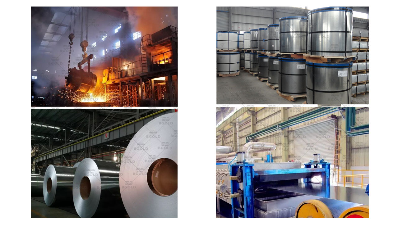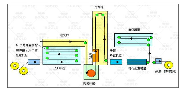 生產加工鍍鋅鋼卷可以分為三大步:首先將整卷帶鋼進行酸洗除銹、除污,讓鍍鋅鋼帶表面達到光亮干凈的效果;酸洗后,通過氯化銨或氯化鋅水溶液或者氯化銨和氯化鋅混合水溶液中進行清洗,然后送入熱浸鍍槽內,進行鍍鋅工藝;待鍍鋅工藝完成后即可入庫包裝